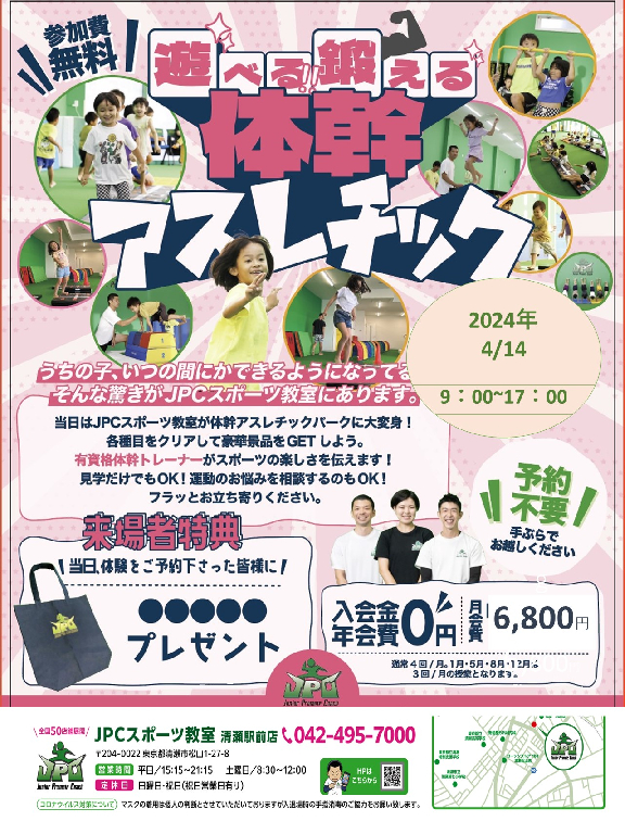 "JPCスポーツ教室清瀬駅前店は西武池袋線清瀬駅南口徒歩2分の場所にある体幹に特化したスポーツ教室です。【整形外科医】が監修する実践的な子供スポーツ教室であり『体幹トレーニングクラス』『マット運動』『跳び箱』『鉄棒』などの運動能力を向上させ怪我に負けない身体作りを目指します。個人のレベルに合わせたクラス分けを設定しておりスポーツが苦手なお子様や運動習慣がないお子様など多様なニーズにお応え致します。jpcスポーツ教室清瀬駅前店では年会費.入会費が0円で体験も無料でご案内させて頂いております。jpcのコンセプトとして各スポーツに必要な「カラダの使い方」を指導します。カラダを動かす際の基礎作りに繋がるインナーマッスルの強化を目的としKOBA式体幹トレーニングやJPCスポーツ教室独自の体幹トレーニングを提供いたします。「柔軟性」「安定性」「バランス」「連動性」の4つの能力強化でカラダの使い方を覚えます。その結果、正しい姿勢が保持出来て軸がブレないカラダになります。スポーツ競技では骨盤が安定して当たり負けないカラダになり連動性が向上してカラダがスムーズに動かせるようになります。体幹を鍛える事は競技力UPだけでなくケガの防止にも繋がります。技術練習も大切ですが、その技術を発揮するための体作りをJPC清瀬駅前店で学んでみませんか? 無料体験.内覧会の予約を随時受け付けておりますので是非jpcスポーツ教室清瀬駅前店にお越しくださいませ。"
